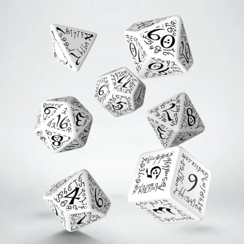Kit de dados Q WORKSHOP da linha ELVISH na cor BRANCA contendo os principais dados para jogar os mais conhecidos sistemas de RPG. São eles: d4, d6, d8, d10, d10 (dezena), d12 e d20.